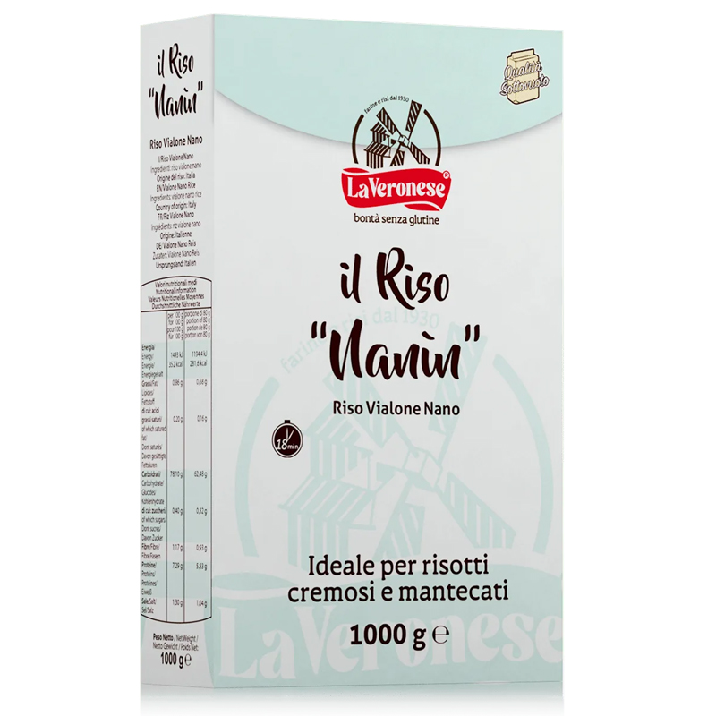 De Nanin rijst van La Veronese is een hoogwaardige Vialone Nano, een Italiaanse rijstvariant uit de Japonica-familie. Deze rijst kenmerkt zich door zijn ronde tot middellange korrel en wordt gewaardeerd om zijn stevige structuur en unieke kookeigenschappen. Dankzij de hoge mate van zetmeelafgifte ontstaat tijdens het bereiden een romige consistentie die essentieel is voor klassieke risotto.
