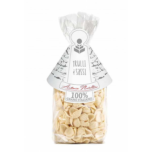 Orecchiette Trulli & Sassi van Antonio Marella is een ambachtelijk vervaardigde pasta, gemaakt van 100% Italiaanse durumtarwe afkomstig uit de regio’s Puglia en Basilicata. Deze pasta, beroemd om zijn typische ‘orecchiette’ vorm die doet denken aan kleine oren, is een symbool van de culinaire traditie van Bari, een stad in het zuiden van Italië. De pasta wordt op traditionele wijze gemaakt, waarbij het deeg door bronzen mallen wordt geperst. Dit zorgt voor een ruwe textuur, waardoor sauzen zich perfect hechten aan de pasta, wat elke hap extra smaakvol maakt.